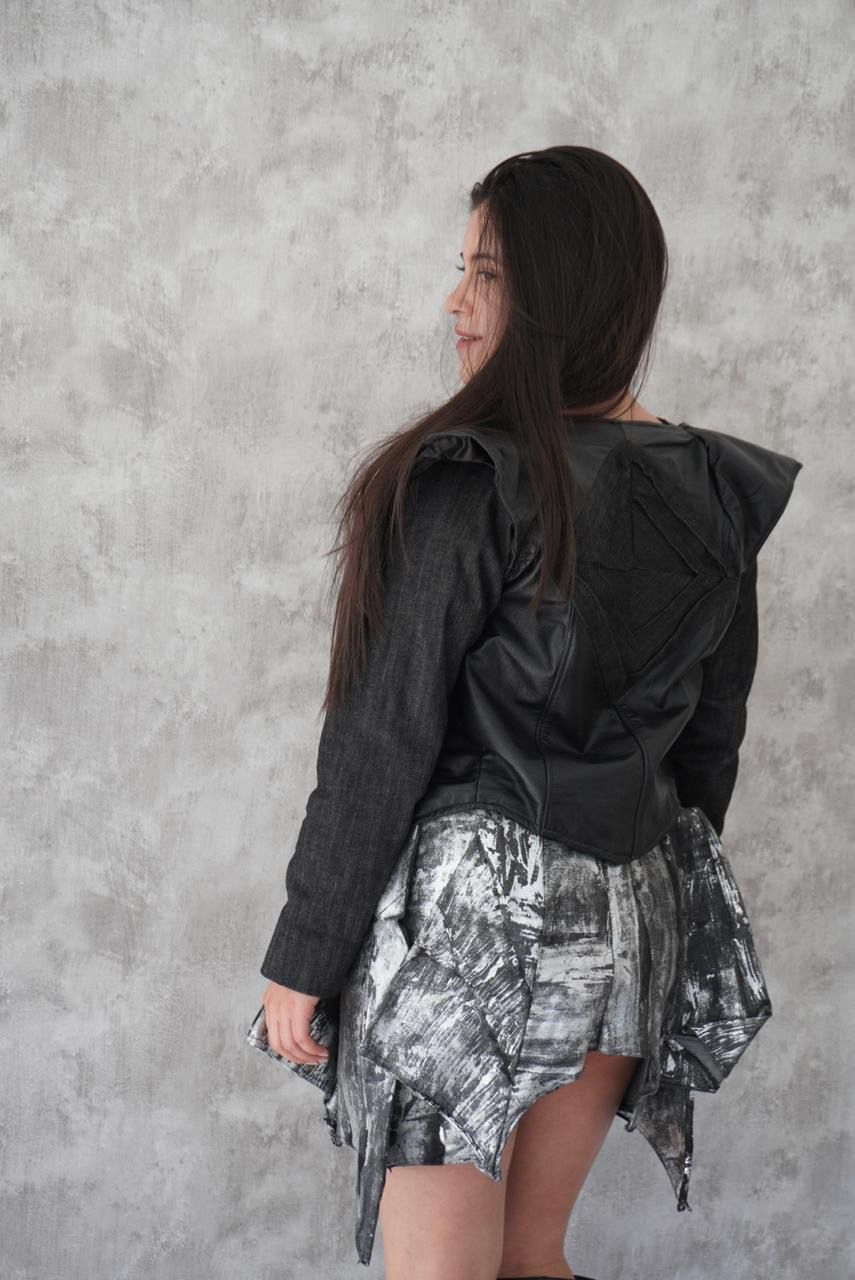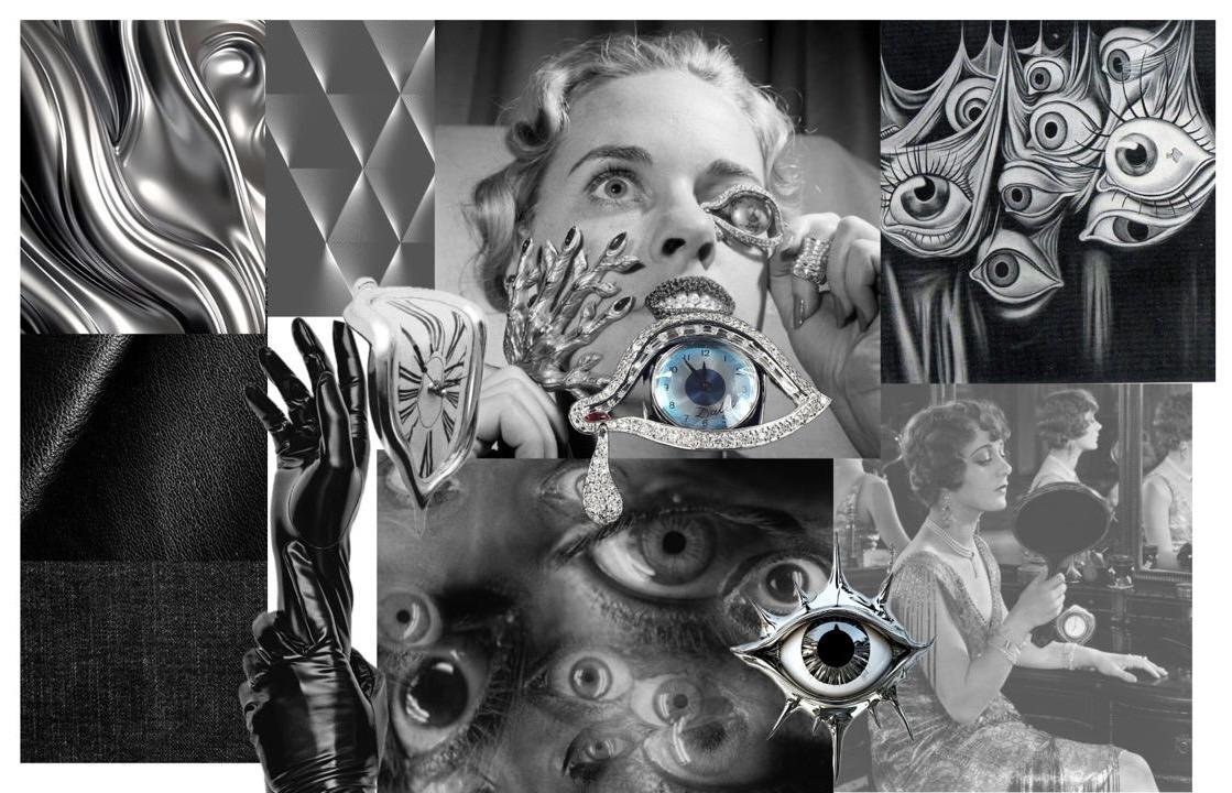 Inspirada en la obra “Ojos sobre la mesa”, esta colección explora la vanidad y lo postizo como un lenguaje estético. A partir de esta reflexión, se plantea una propuesta que responde a la necesidad de la mujer contemporánea al salir de fiesta, ofreciendo siluetas con volumen y movimiento. Las formas circulares y rombos se entrelazan en una paleta de negro, blanco, azul y plateado, evocando un universo gótico con toques futuristas. El cuero y el denim se convierten en protagonistas, fusionando fuerza y vanguardia en una estética que desafía lo convencional.